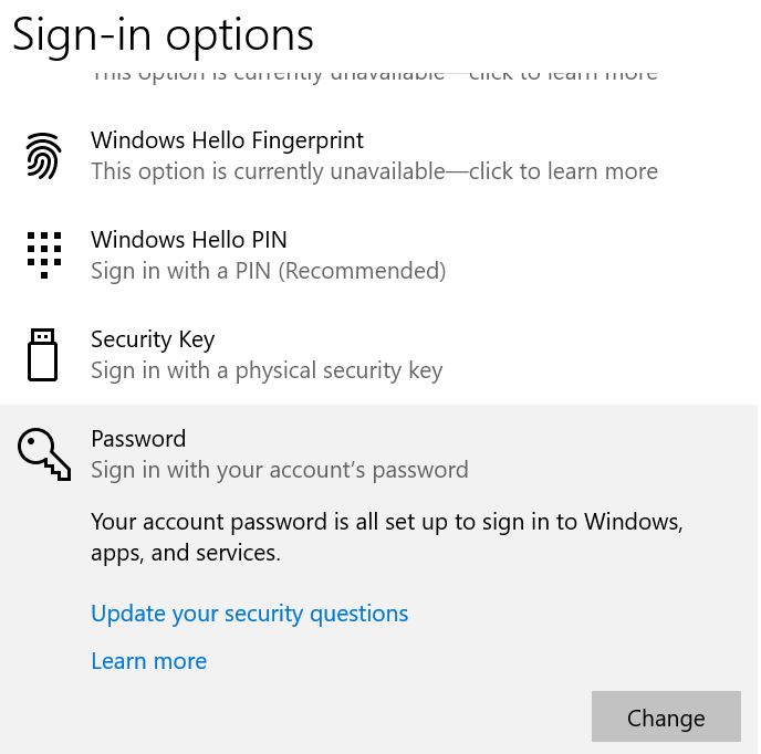 - Then Select "Password" under "Manage how you sign in to your device" > Click the Change button.